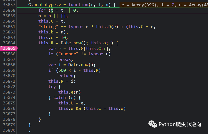 然后就在 35865 行打上 log 输出断点,把 this.C 索引值跟 this 对象里面的值都给打印出来,注意要把 window 除去,不然会缺数据,索引值方便后序调试可用