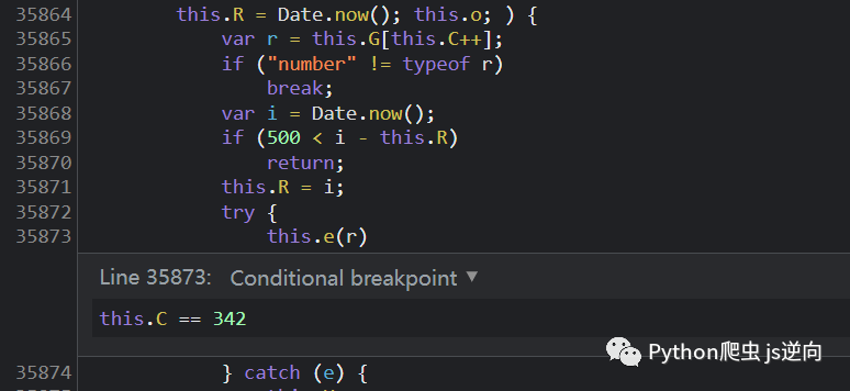 重新打开一个浏览器打开链接,在 log 输出相同地方换上一个条件断点,断点的条件是 this.C = 342,具体跟进去看看他到底是进行的什么运算