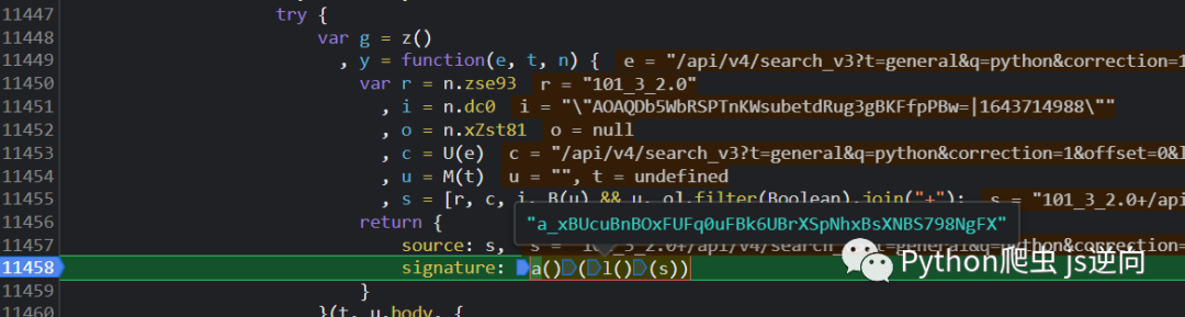 选中 a(),点进去,会进入到这个函数,加密参数正是第一层加密得到的 md5 字符串,如图所示