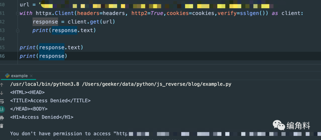 既然已经可以随意改了对吧,那我改成 python 默认的指纹访问下这个网站看看呢?我下面只改了 ja3 指纹,看运行结果,果然是被拉黑了,哈哈哈哈