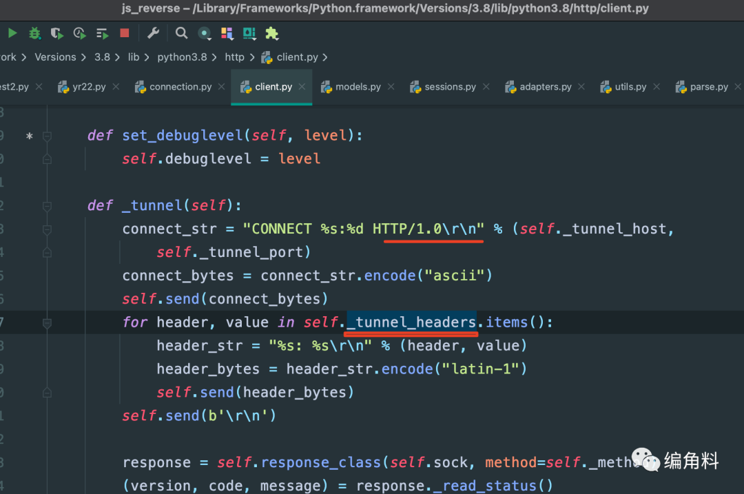 但是,相信对这个 tls 有过相关经验的大佬来说,其实在调试 requests 请求时,调试到这个 http/client.py 文件库里时,就能看到,在开始 connect 时 http 版本直接写死成了 1.0,还有这个建立连接的 tunnel_headers,代码给了个空值