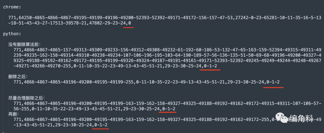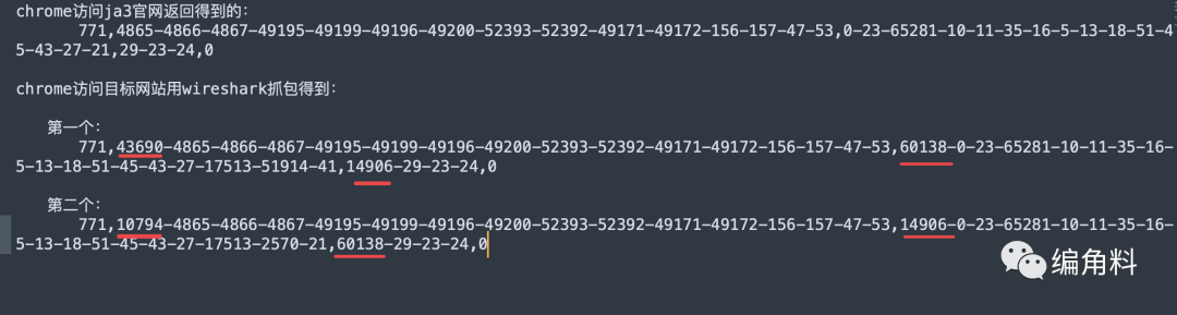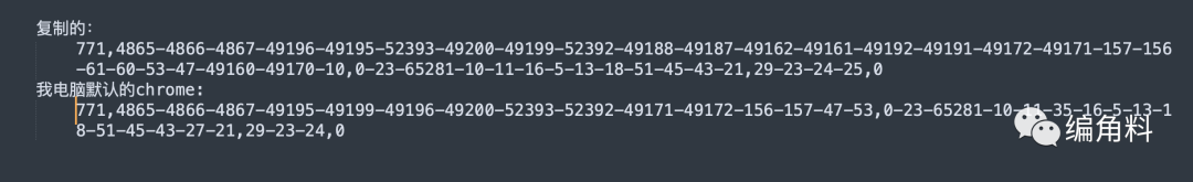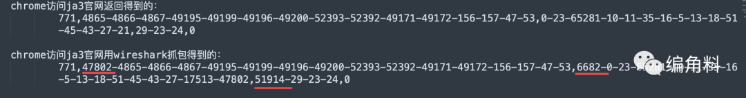 那有朋友估计会想问,“那为啥之前猿人学 19 题可以过?” ,那是因为 19 题检测的不严,只要 ja3 指纹长度小于等于浏览器的指纹长度都可以过,但其实还有很多特征的可以检测到的,来,看图,还是上次的图,看最后一个数有很大区别的,这个我在上一篇的结尾里也把这个问题抛出来了
