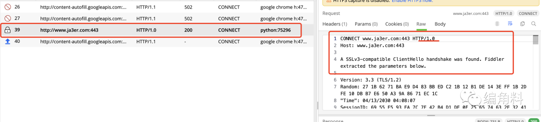 如果你再配上 fiddler 或者 charles 抓包看的时候,明显能看到,在 python 发送实际请求前的 CONNECT 请求如下: