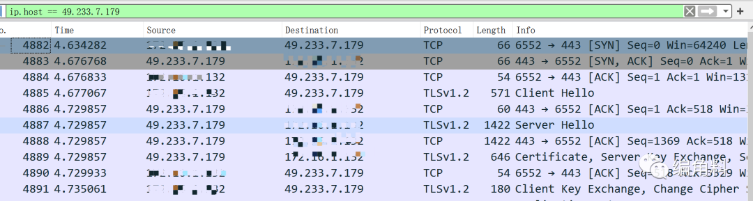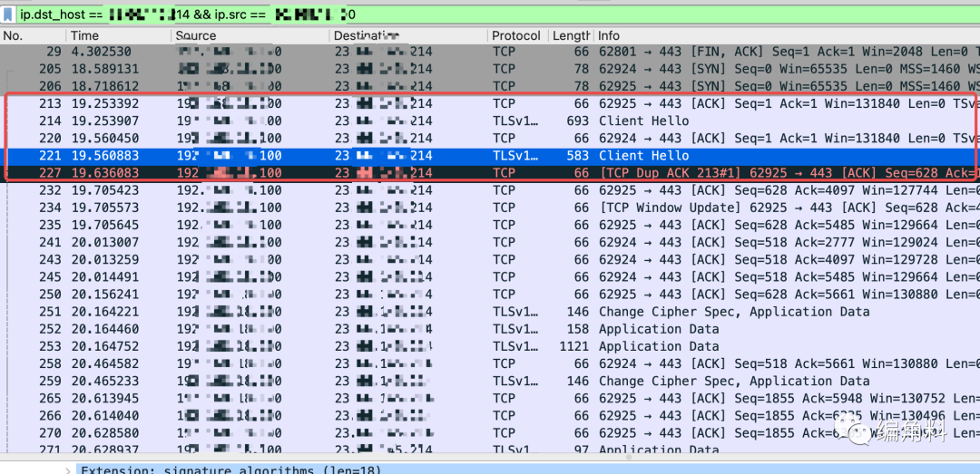去掉上面标记出来的,其实第一个和第二个是一样的,仅仅是这个被我马赛克马死的平台是这样,我猜应该是这个平台自己多加了一层握手流程,所以会有 2 个 client hello,具体为啥有两个不纠结了,我也不是该平台的开发,也没法得知具体原因,不重要了,能获取数据就行了。