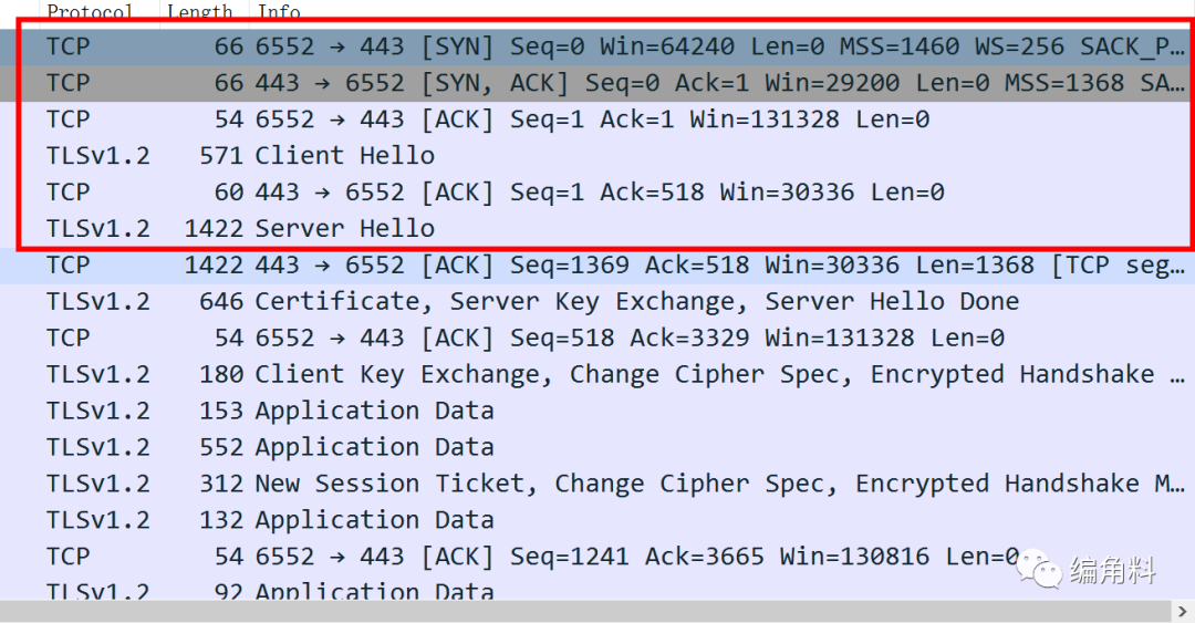 注意看,最开始的 6 个数据包就是上面说的流程,前三个是三次握手,第四个开始到第 6 个就是 ja3 的 hello 数据包,个人感觉这段过程也很像三次握手,再后续的数据包就是实质的 ssl 数据交互了,