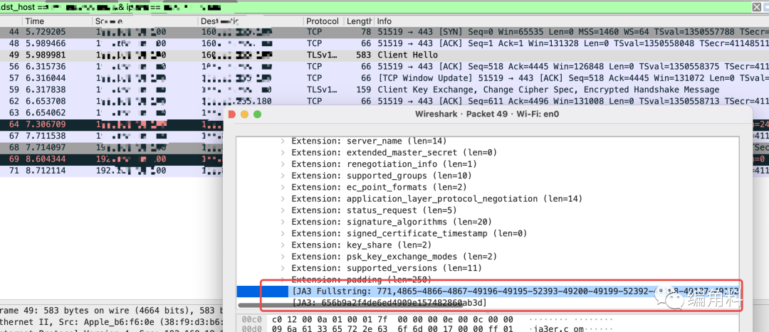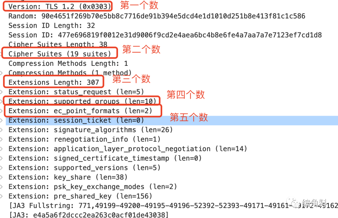 所以我跟 chao 讨论之后,认为 ja3 其实并不存在(上一次这么醍醐灌顶还是读到《三体》里的那句台词 “物理学不存在”,不好意思又扯远了。。。),或者说 ja3 并不是实质性存在的字符,而是通过 TLSVersion,Ciphers,Extensions,EllipticCurves,EllipticCurvePointFormats 这五个 tls 组件根据自己的加密算法另类存在的,因为 wireshark 都能通过自己的解析逻辑解析显示啊。以上推论仅代表个人观点,有误请指正