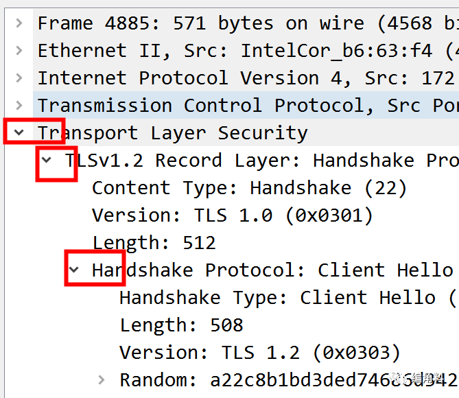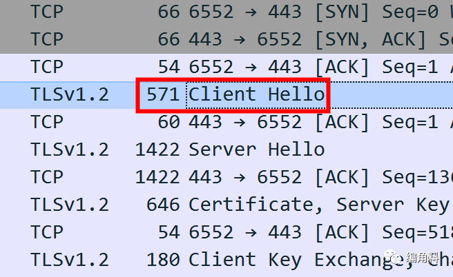 有了这个,看看 ja3 指纹到底是啥样的,双击这个 client hello,然后服务端返回的 sever hello 就不看了,此时不需要看,忘掉它吧
