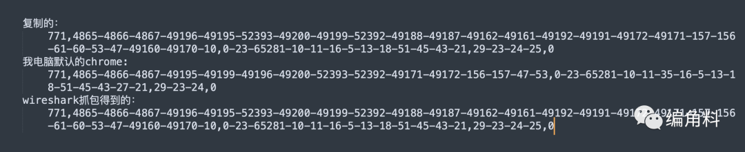 771,4865-4866-4867-49195-49199-49196-49200-52393-52392-49171-49172-156-157-47-53,0-23-65281-10-11-35-16-5-13-18-51-45-43-27-21,29-23-24,0chrome 访问目标网站用 wireshark 抓包得到: