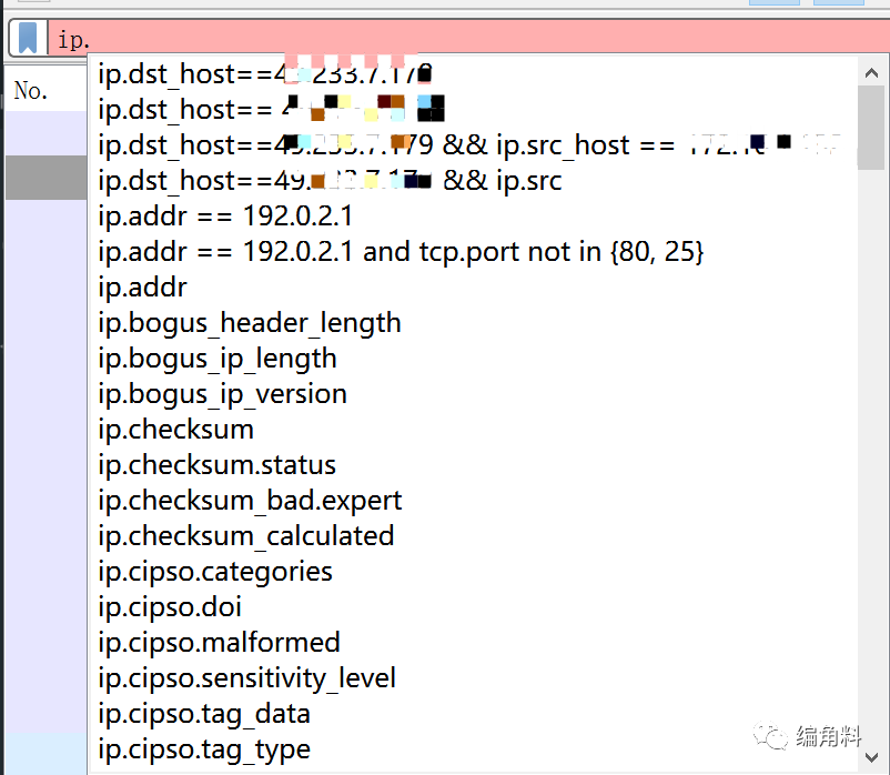 此时你会看到很多的数据数据包,过滤一下,直接在过滤器位置输入 ip.,就会有很多指令提示和历史记录