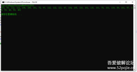 输入 52pojieHappyChineseNewYear2021 到输入框,点击验证按钮,提示成功!本题分析结束。