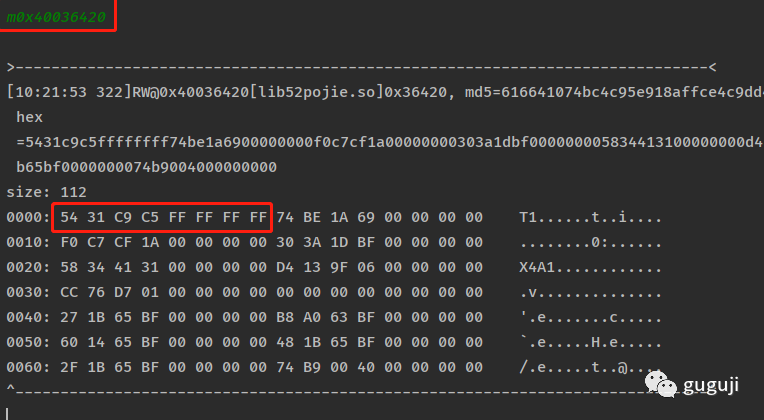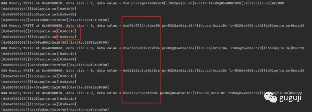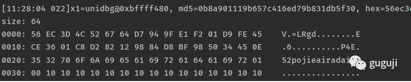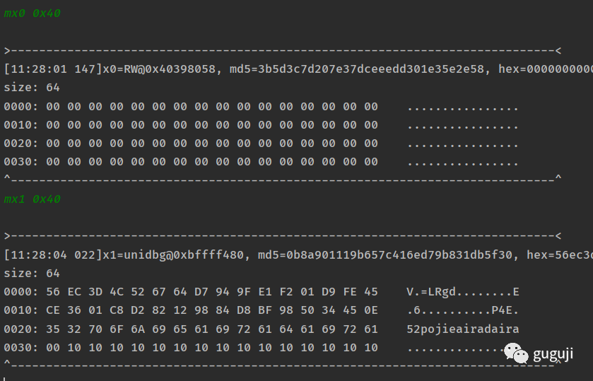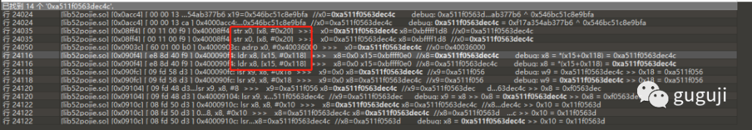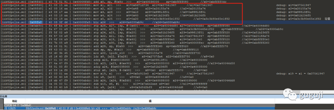 通过 unidbg 的 debugger 功能断点调试,查看 x0 和 x1 地址处的内存值