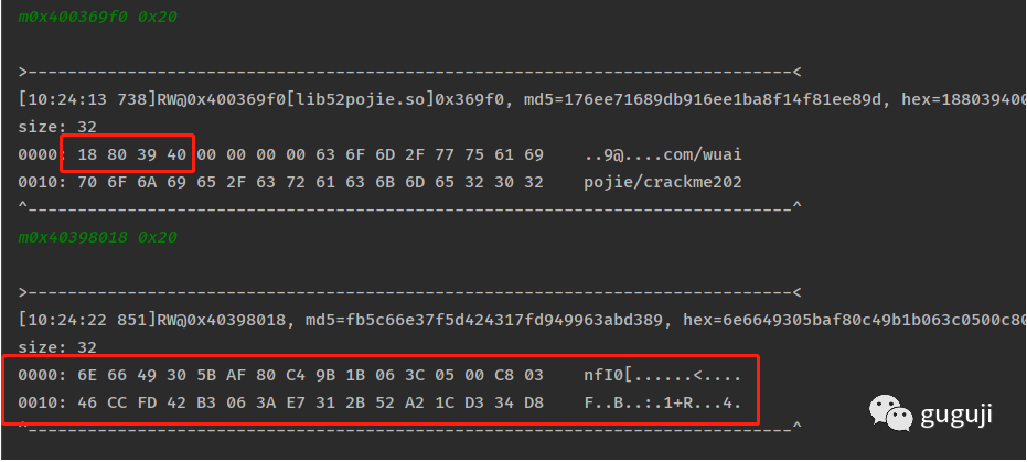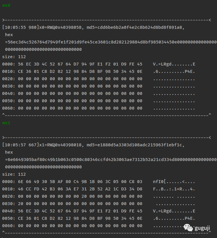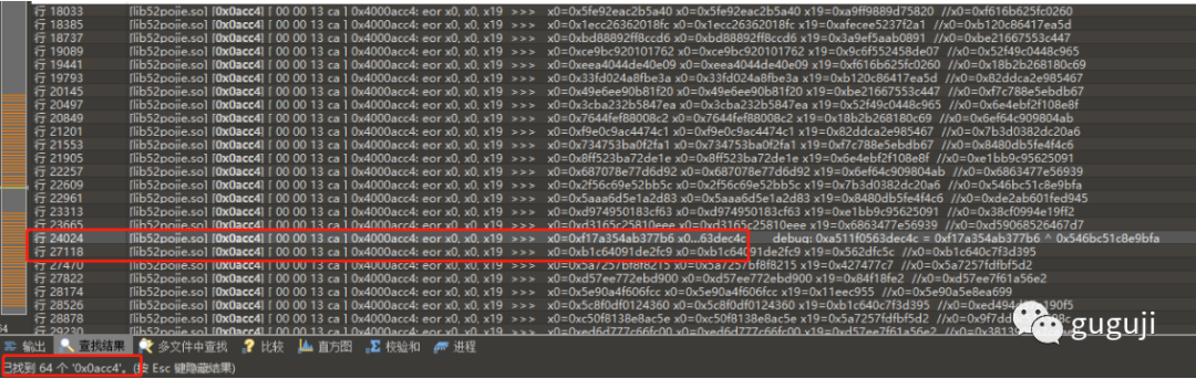 得到两个 32 字节长度的 hex,初步判断这里可能就是最终需要做判断的两个值,通过修改入参发现,x0 在内存中的值动态变化,x1 在内存中的值是固定不变的,记录下这个地方的值